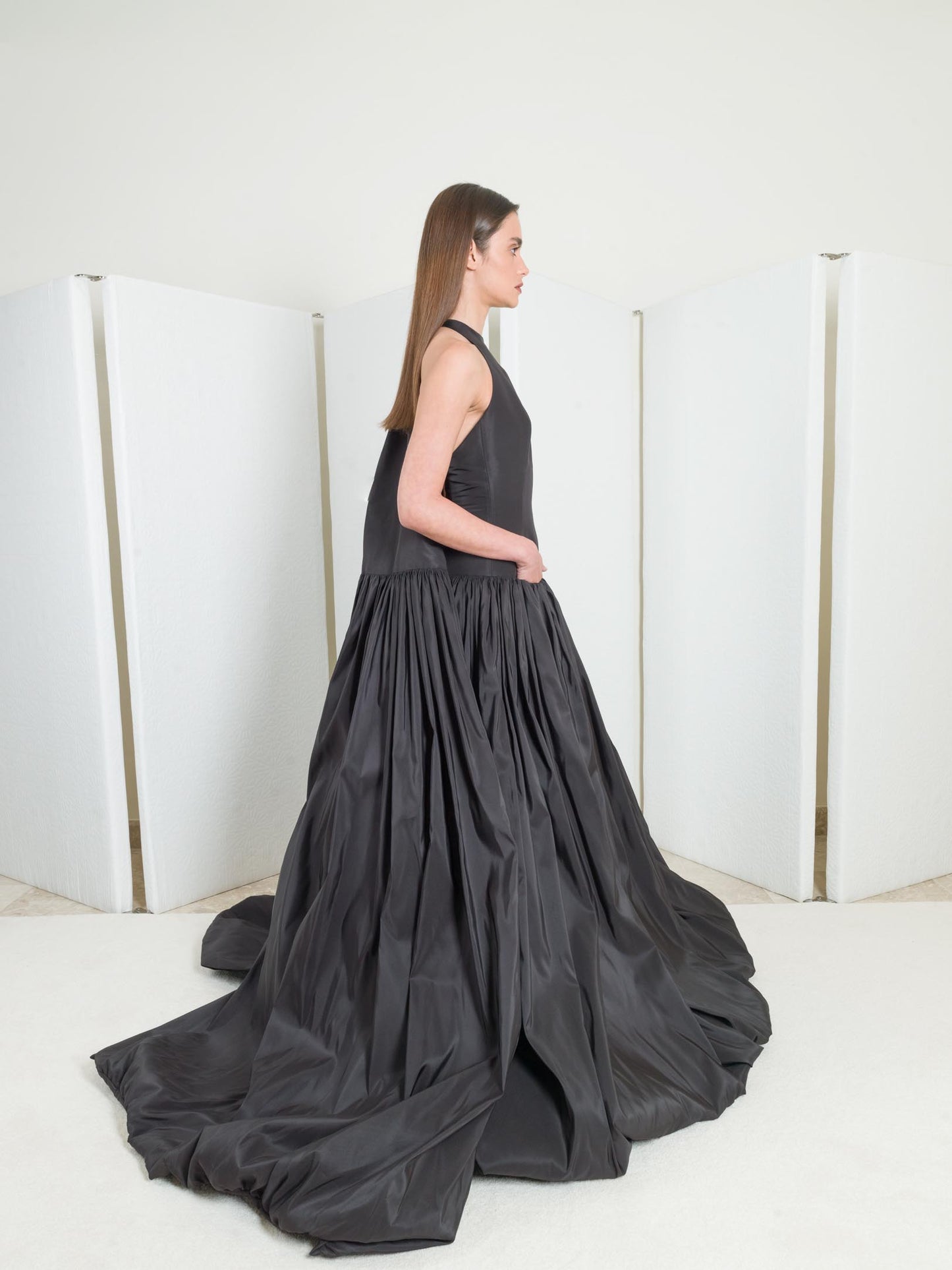 • gown that has a cape-effect overlay that falls to a dramatic floor-sweeping train at the back and ties in an elegant bow