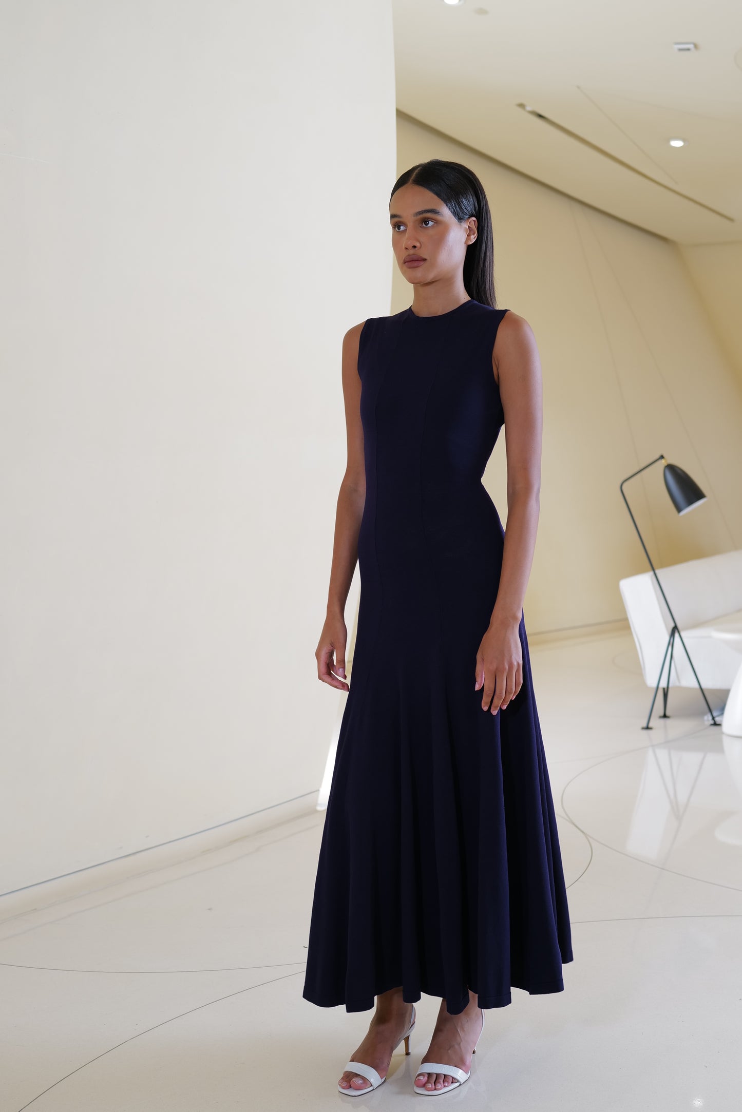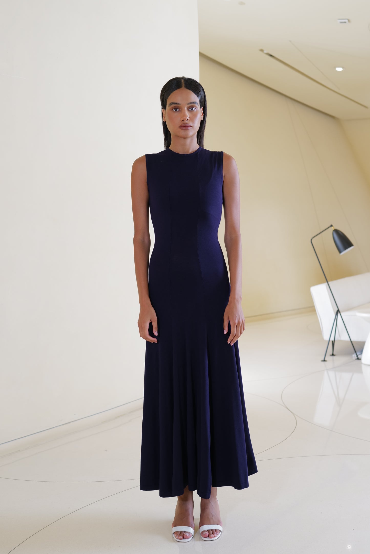 This dress has flared silhouette that falls to the ankles, available in colors.