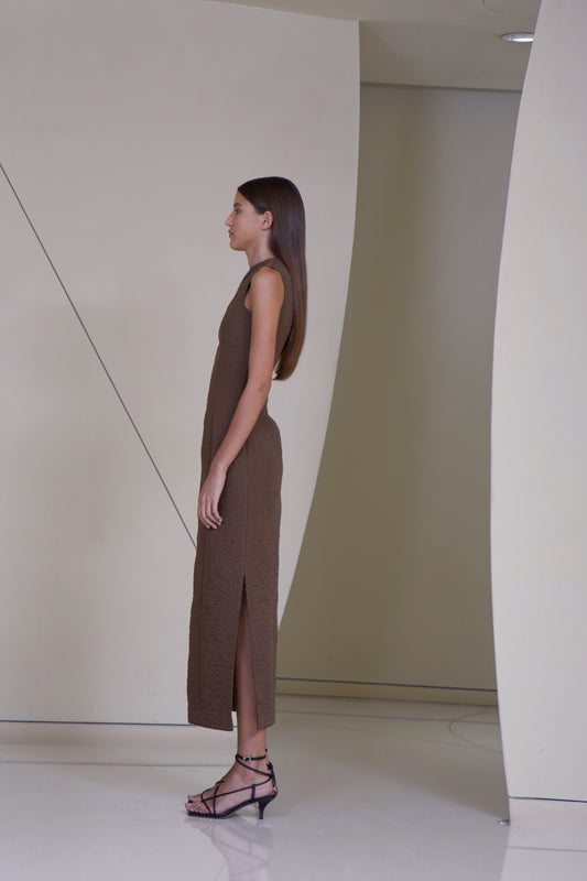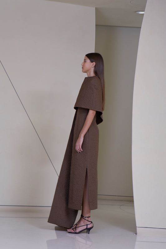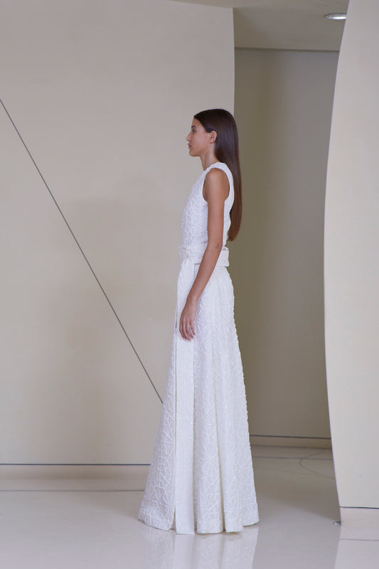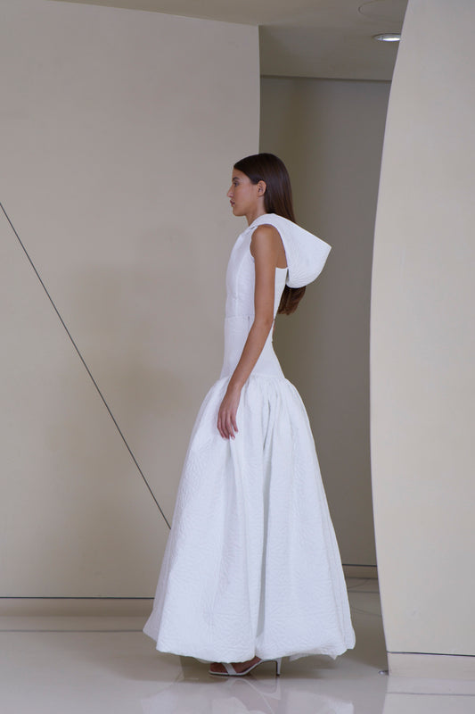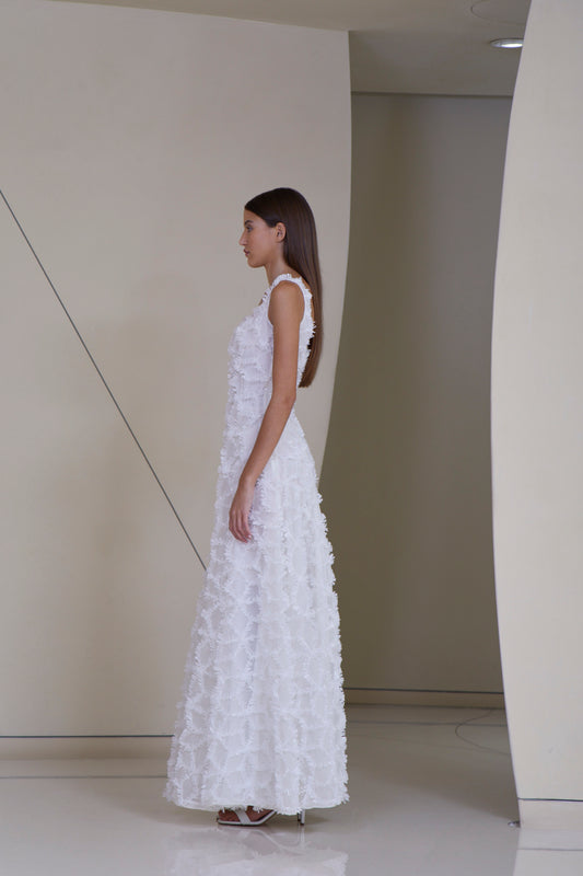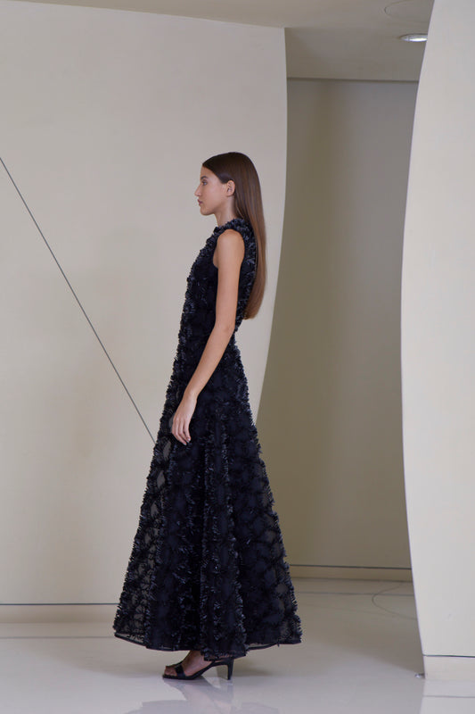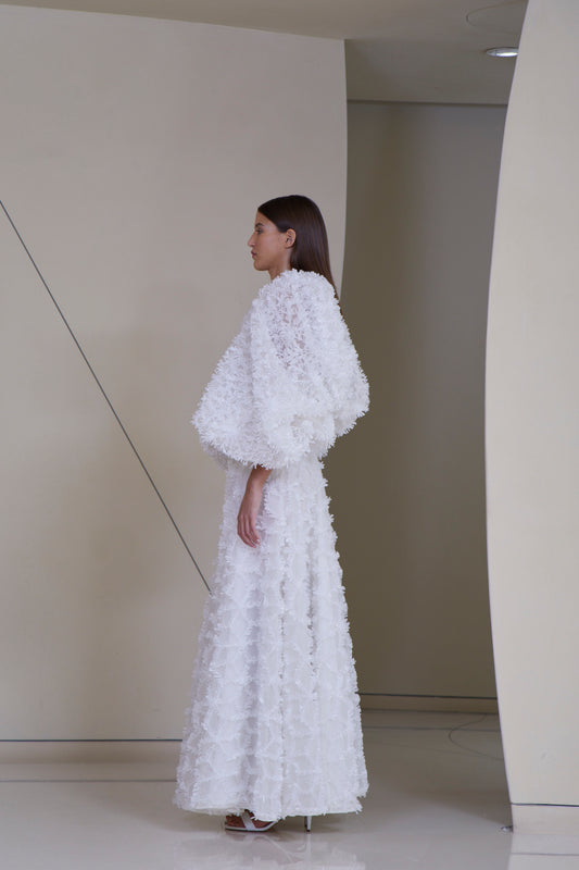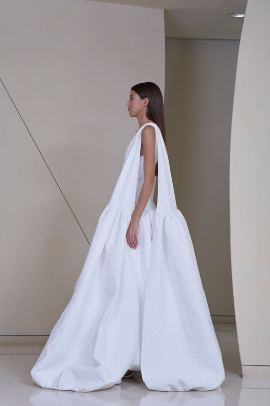 Voluminous Gown in silk organza with Full Raffia Geometric design