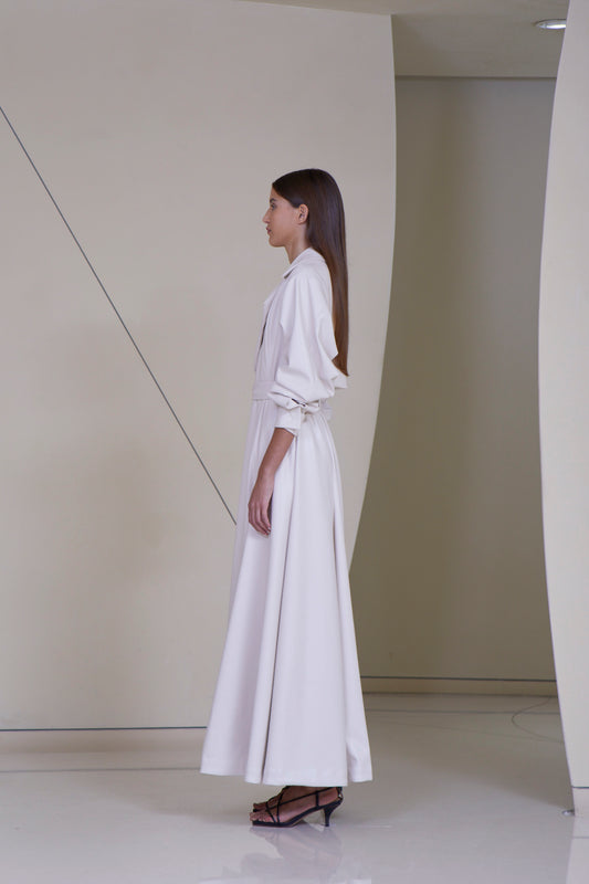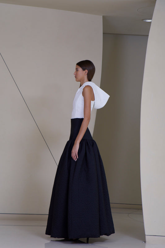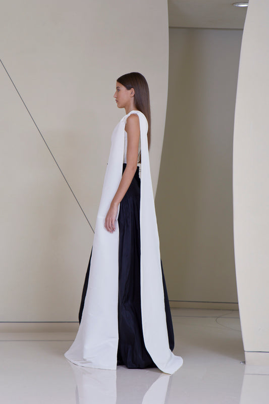Asymmetric Top with Side Cape tie & Voluminous High Waisted Skirt with front hidden pockets in silk Faille