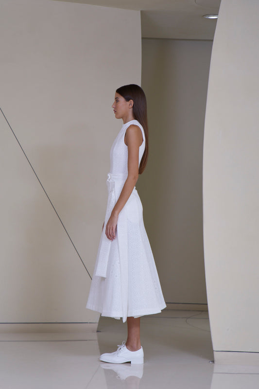 Asymmetric straight cut dress with side cape tie in silk crepe