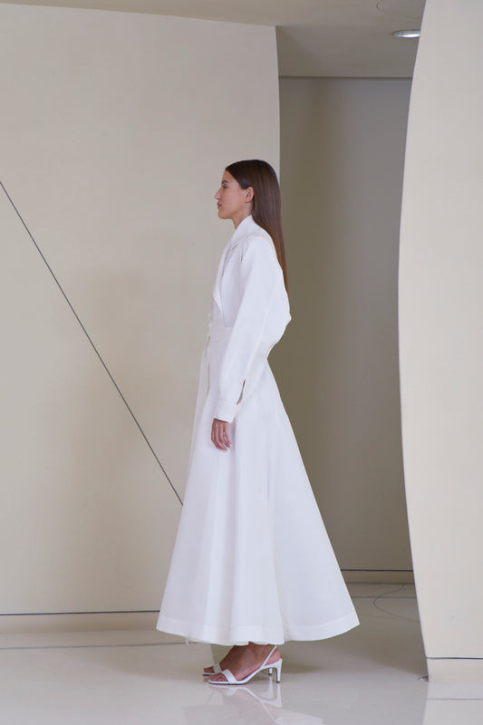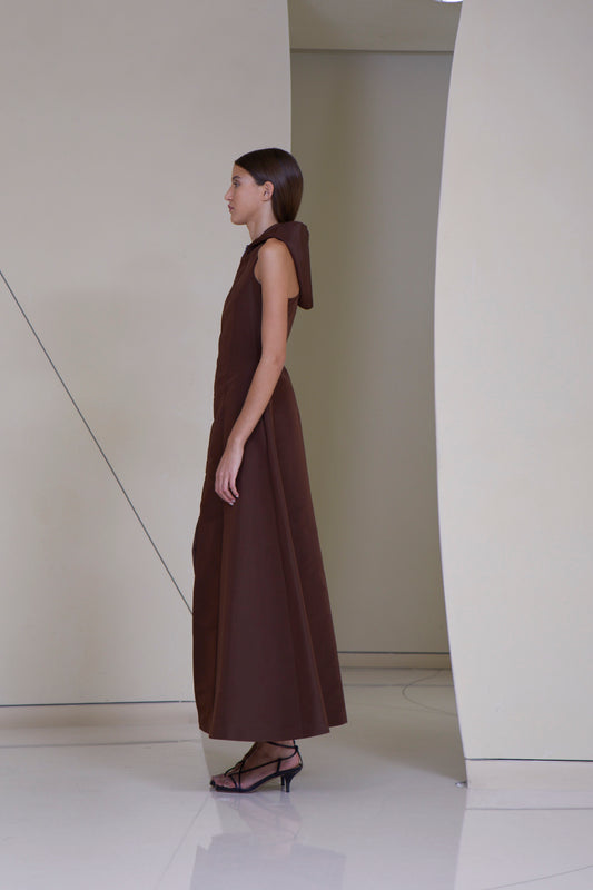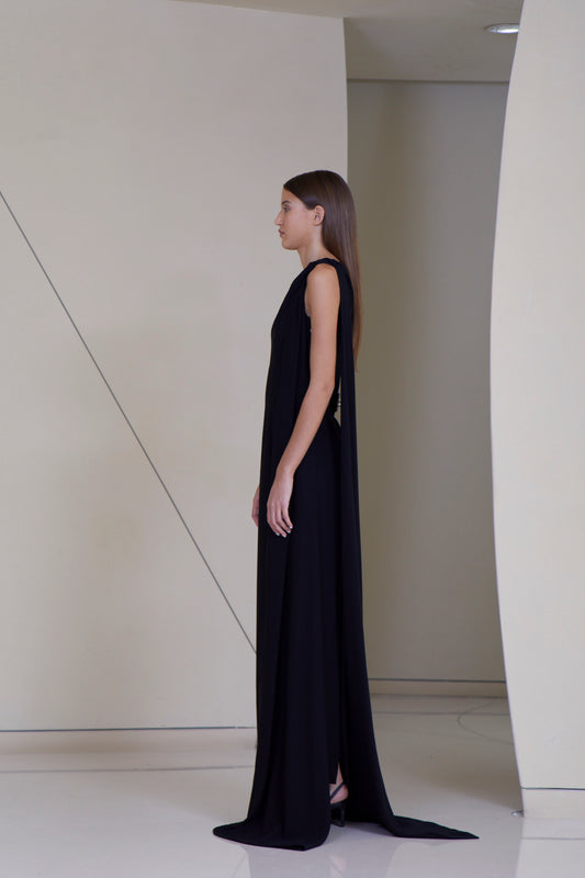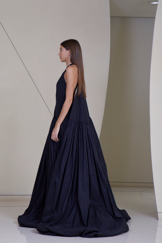 Open Back Voluminous Gown with back tie cape in silk Faille