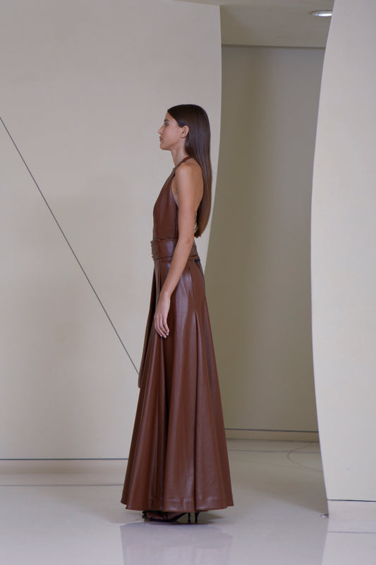 Halter Back Top with High Waisted Maxi Wrap Skirt in Faux Leather