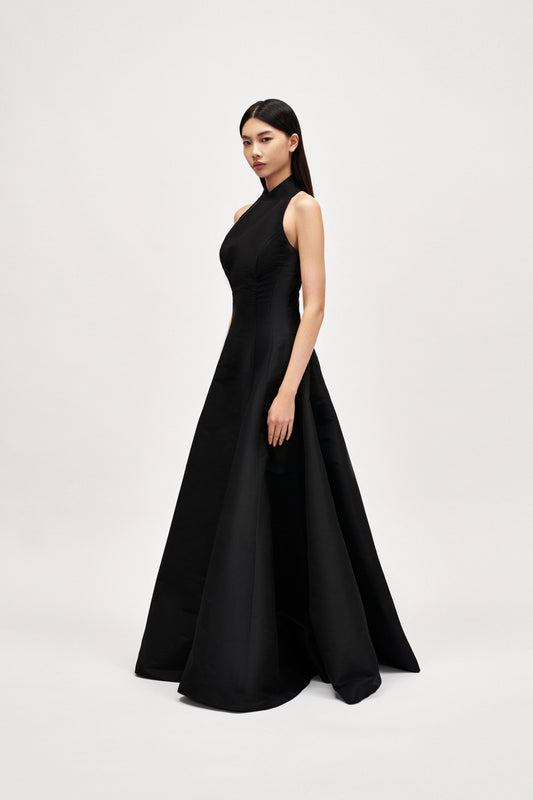 Halterneck back tie gown with corset in silk faille
